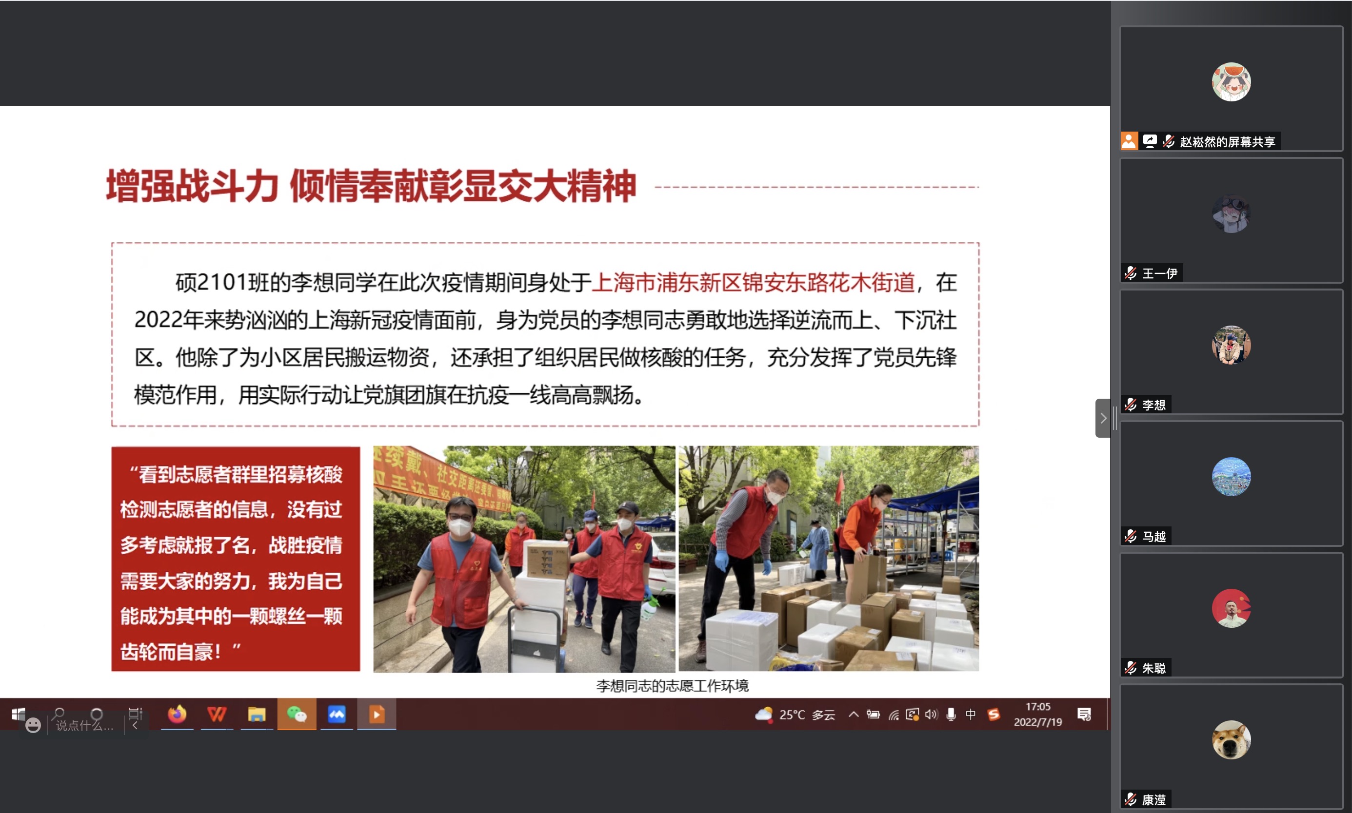 自疫情防控工作开展以来,在学校、学院的坚强领导下,全体研究生上下团结一心、众志成城,涌现出一批表现优异的抗疫榜样和抗疫事迹。在党课学习中党支部书记阐释了伟大抗疫精神的深刻内涵,同时带领党员干部们通过一个个充满正能量的抗疫故事,更加坚定抗疫必胜信心,增强积极参与疫情防控和各类志愿服务的行动自觉。