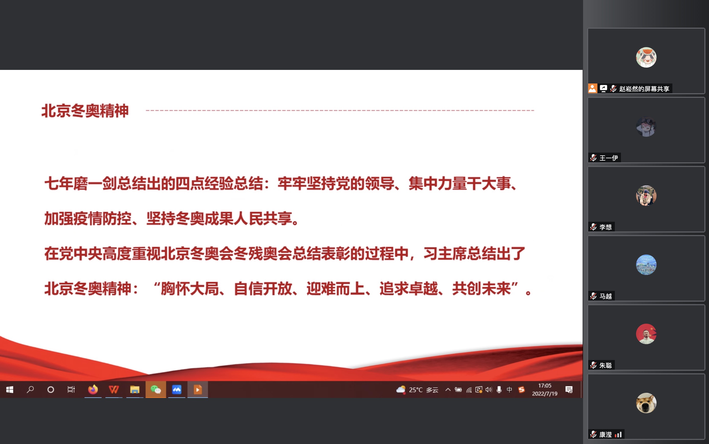 全体党员观看了由支部成员制作的《冰之帆》北京冬奥志愿者视频,回顾了从今年一月到四月国家体育馆中冬奥志愿者们的动人画面。志愿者计鉴洋同志也进行了“功成不必在我,功成必定有我”主题宣讲,计同志指出自己所在的志愿者团队的日常任务看似都是些非常细微之事,但在亲身实践后才能体会到小事不小,把一件件小事做好,也有着非常闪耀的价值。随后,支部书记重点带大家学习了北京冬奥会冬残奥会总结表彰大会的重要讲话内容,习主席总结出了北京冬奥精神:“胸怀大局、自信开放、迎难而上、追求卓越、共创未来”。七年磨一剑总结出的四点经验总结:牢牢坚持党的领导、集中力量干大事、加强疫情防控、坚持冬奥成果人民共享。