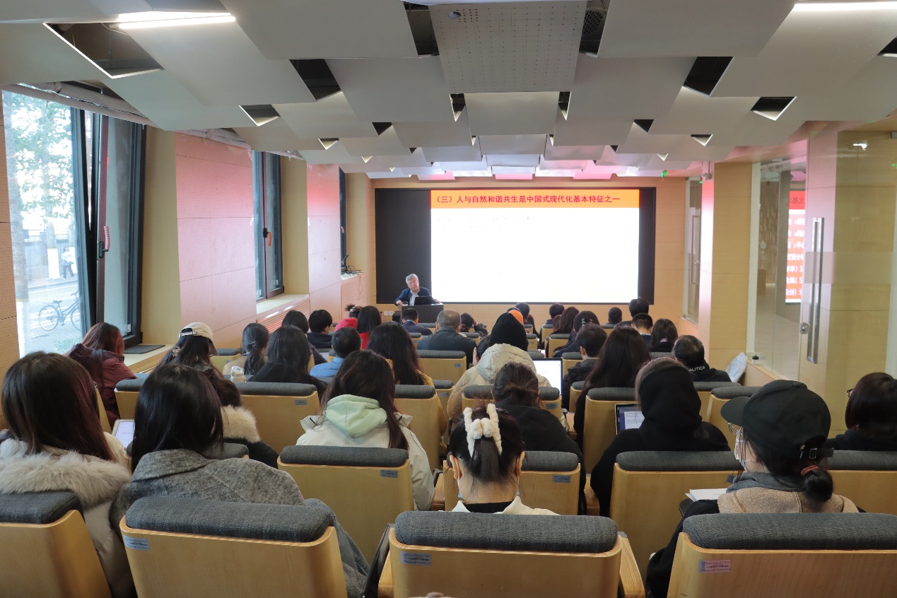谷树忠研究员从长期理论研究和实践出发,围绕“人与自然和谐共生是中国式现代化的基本特征”“学习总书记关于人与自然和谐共生的重要论述”“发扬光大人与自然和谐共生中华优秀传统文化”“充分认识人与自然和谐共生的重要性与必要性”“系统推进人与自然和谐共生中国式现代化建设”五个方面进行了系统阐述,让与会师生更深入地理解了人与自然和谐共生的重要意义和系统推进中国式现代化建设的科学路径。