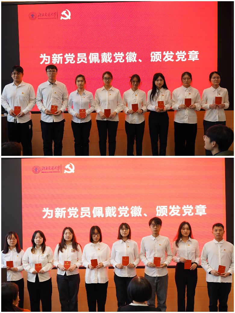 “当我把党徽戴上,使命在胸前发光”,伴随着音乐《把党徽戴上》,学院党委副书记刘萍为全体新发展党员颁发党章,全体辅导员为新党员佩戴党徽。