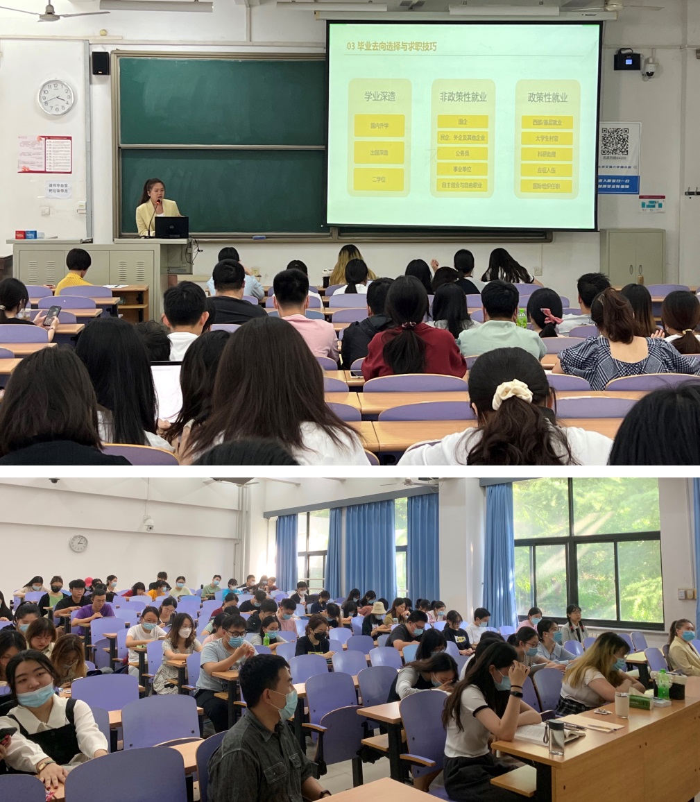 李萌从身份认知,毕业去向选择,保研考研和政策性就业的“上岸”技巧等方面为同学们开展了就业知识通识培训,帮助同学们了解各专业的社会需求情况,理清深造及不同形式就业的推进头绪,介绍了学校、学院在就业和生涯规划方面的指导帮扶工作体系,鼓励同学们以积极的心态面对压力,以主动的方式寻求资源。
