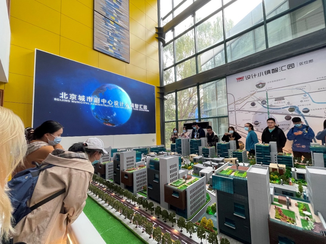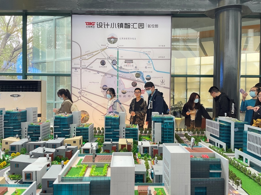参观完燃灯塔,师生们来到位于通州新城核心区的北京城市副中心设计小镇智汇园。通过观看介绍短片,了解到了作为北京城市副中心的通州新城“北京发展新磁极、首都功能新载体”的发展定位。工作人员结合沙盘模型为我们介绍设计小镇的规划布局,接着大家亲自步行体验了设计小镇的建成环境。