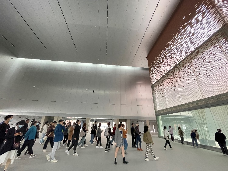 之后师生们来到位于由北泡轻钢厂夹芯板车间改造的北京国际设计周永久会址。中国建筑设计研究院设计团队遵循“尊重历史,延续肌理,织补新旧”的原则进行改造,保留原有钢结构和厂区肌理,将老的钢梁外露,厂房中间部分加高至15米可满足大型艺术展览需求,抬头看可见采光天井和两侧玻璃充分利用自然光,极大降低用电能耗。正对入口的大玻璃实则是一块隐蔽的屏幕,走近才能看见电子元件,设计巧妙。
