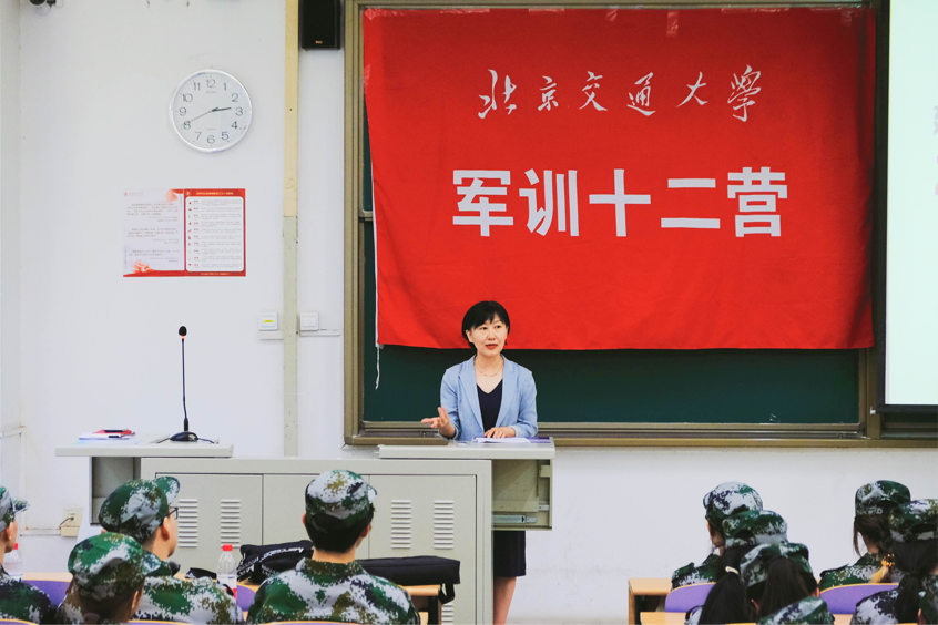 张京介绍了军训课程意义、军训日程时间安排、军训编组分配、军训纪律要求及成绩细则,帮助同学们熟悉军训内容、做好心理准备。她带领全营学生共同喊响十二营口号,凝聚信心,提振士气。