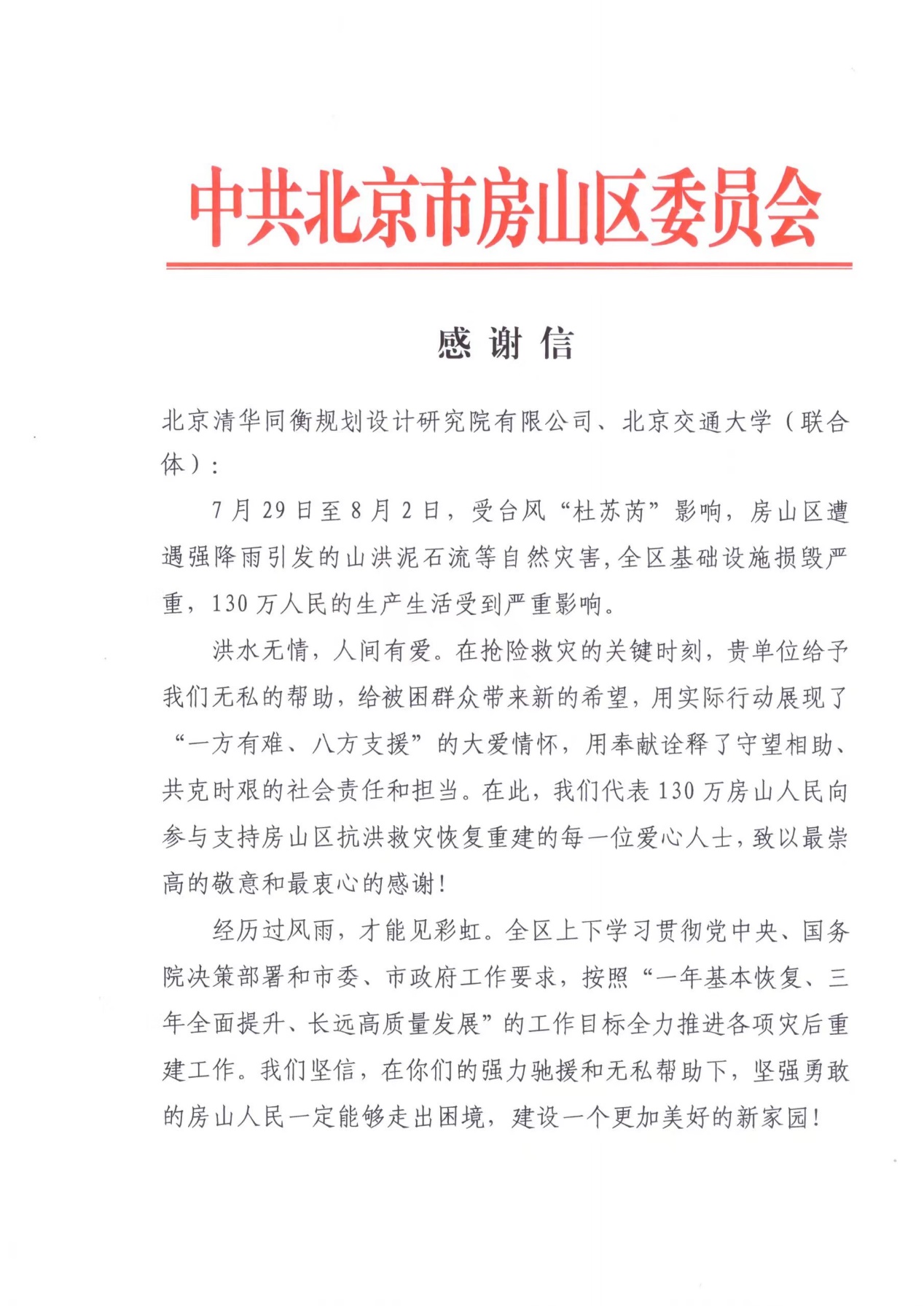 北京市房山区委区政府在感谢信中提到,7月29日至8月2日,房山区遭遇强降雨引发的山洪泥石流等自然灾害,在抢险救灾的关键时刻,我校给予房山区无私的帮助,用实际行动展现了大爱情怀,用奉献诠释了高校的社会责任和担当。房山区灾后重建工作由成人视频 副院长佘高红,城乡规划系主任王鑫,副主任张纯,朱高儒、徐凌玉、徐高峰、张威涛等多位教师组建师生团队参与。