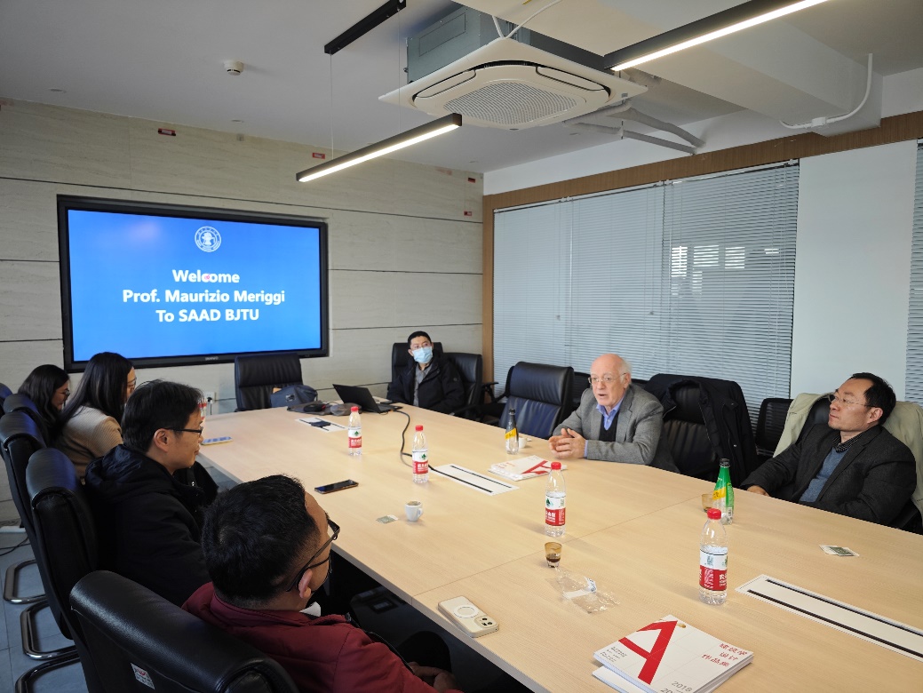 副院长佘高红代表学院向MAURIZIO MERIGGI教授此次访问交流表示欢迎,希望可以与米兰理工大学建筑、城市规划和建造学院建立长期的教学、科研交流合作。系主任王鑫介绍了我院的发展历程、专业方向以及教学科研情况等。MAURIZIO MERIGGI教授感谢学院和韩林飞教授的盛情邀请,他曾多次到访我校,对于学院近几年的发展以及教学空间更新改造成果表示肯定,也分享了米兰理工大学建筑、城市规划和建造学院的近些年相关办学情况及个人在绿色城市、建筑遗产相关方面的研究情况,期待未来两校合作交流活动能够得到更近一步的推进和发展。