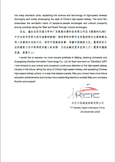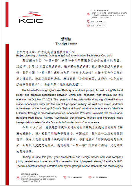 近日,学校收到来自印尼中国高速铁路有限公司的感谢信,对成人视频 与校企合作单位以雅万高铁为主题共同创作的动画片《高高的礼物》给予高度评价和诚挚感谢!
