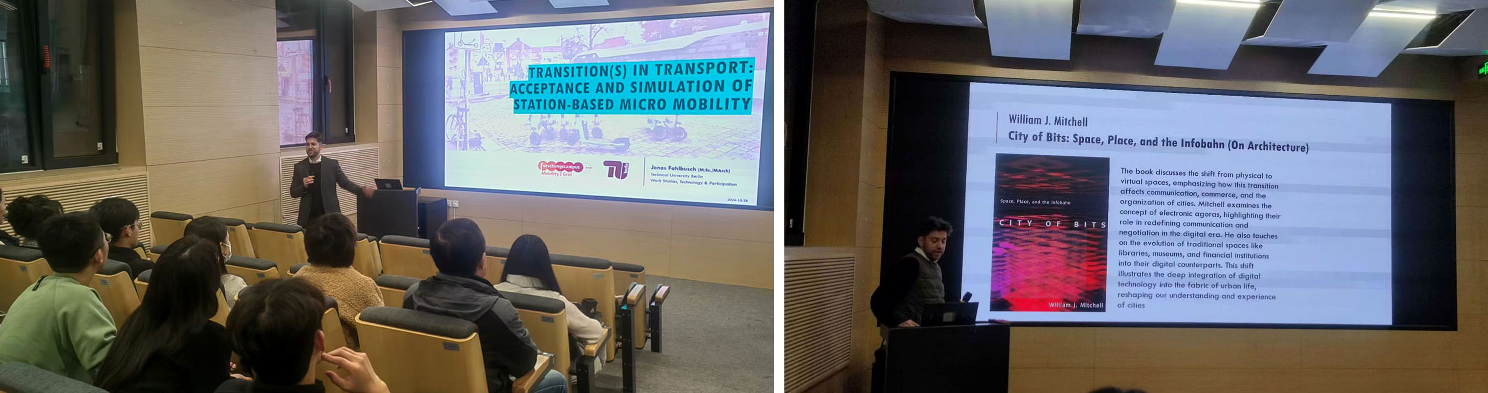 2024年10月28日-11月6日,成人视频 设计系“2024年中德高校智慧城市设计研究生教学实践与交流”项目负责人魏泽崧老师邀请德国柏林工大智慧城市研究所“Mobility2Grid德国城市战略”项目主持人Jonas Fahlbusch博士,为研究生进行了《交通规划设计的未来机遇与局限》、《城市与景观规划中的开放数据》等多个专题的授课与讲座。