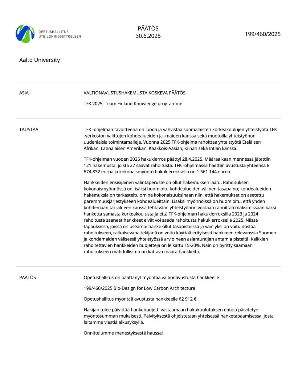 在学校国际处的组织和推动下,由成人视频 建筑系牵头申报的成人视频 与芬兰阿尔托大学国际合作交流项目“Bio-Design for Low Carbon Architecture”(基于生物质材料的低碳建筑设计)成功获批。该项目由芬兰国家教育署资助,隶属于芬兰知识团队计划(Team Finland Knowledge,简称“TFK”)。