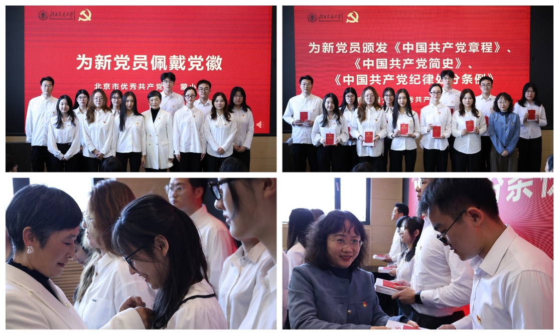 “当我把党徽戴上,使命在胸前发光”,伴随着音乐《把党徽戴上》,蒙小英为新发展的党员佩戴党徽,李珺杰为党员们颁发《中国共产党党章》《中国共产党简史》《中国共产党纪律处分条例》。庄严的仪式象征着老党员对新党员的期望与嘱托,激励同学们向优秀党员学习。
