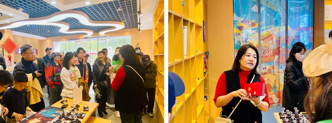 游船游览结束后,在通州区园林绿化局相关负责同志陪同下,老师们步入植被茂盛、规划有致的生态森林公园,公园物种丰富,鸟语花香,听着魏老师一路讲解大运河文化旅游景区打造“一环线五片区”亮点提升工程,照亮古今同辉北京城市副中心的建设历程,老师们登上月岛闻莺观景平台,远眺对岸北京市政府和商业区,首都副中心的市容风貌映入眼帘,大家纷纷感叹通州大运河古今之际和厚重的历史和宜人的环境。随后,老师们来到大运河景区文创店,看到了由我院师生设计团队设计的吉祥物“大运”和潞河督运图等具有鲜明大运河历史的文化衍生产品。