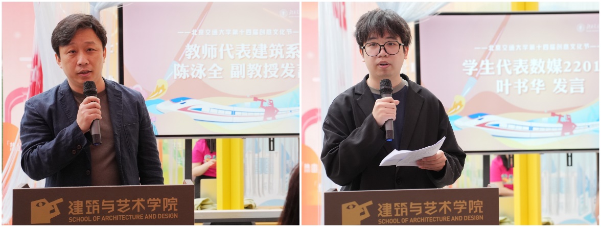 建筑系副教授陈泳全代表指导教师发言,分享了10年来带领学生开展建造节的体验和感受;数字媒体艺术2201班叶书华代表参与学生发言,分享了自己对当今艺术从业者如何将技术化为情感表达媒介的使命和责任的思考。