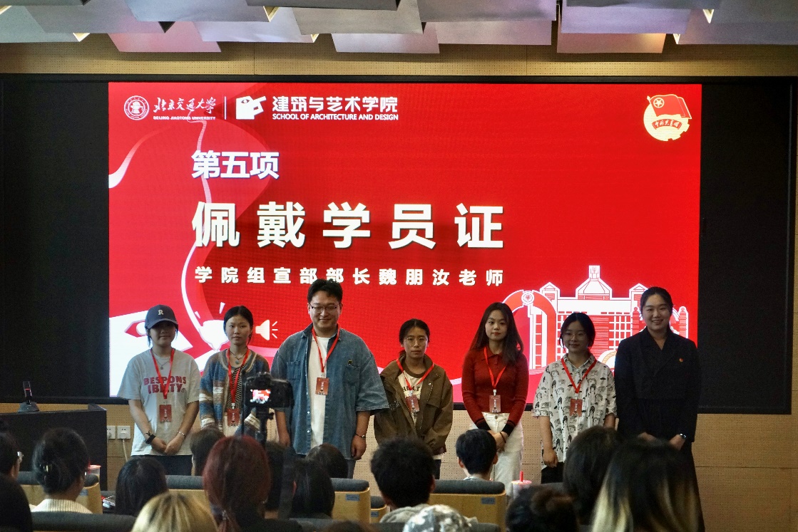学院组宣部部长、本科生辅导员魏朋汝为第四届“瞭望者”计划学生骨干培训代表佩戴学员证。学员证由建艺学生自主设计,以朝气蓬勃,温暖洋溢的橘红色为背景,下方的人物用一双望远镜向远方眺望,象征着朝气昂扬的建艺学子,在充满挑战与希望的未来勇担重任,为实现中华民族的伟大复兴而奋斗。